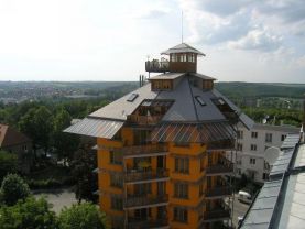 Luxusní mezonetový byt ve třech podlažích v žádané, klidné lokalitě Prahy 6 - 7.n.p.- 4 pokoje+kk,WC,koupelna-104m2 + 3 terasy 28m2, 8.n.p.-1 pokoj 54m2,koupelna s WC, 9.n.p. observatoř 6m2 terasa 14m2, sklep 14.5m2,2 garážová stání v sousedním objektu. Byt má parketové podlahy (buk), kuchyňskou linku vč. spotřebičů. 2 skříně Woodface. V koupelně je masážní vana. Byt má unikátní polohu na okraji areálu "Hvězda" dle projektu arch. Miluniče - autor projektu Tančící dům s výhledem na oboru Hvězda, Divokou Šárku a České středohoří. Areál je střežen bezpečnostní službou.